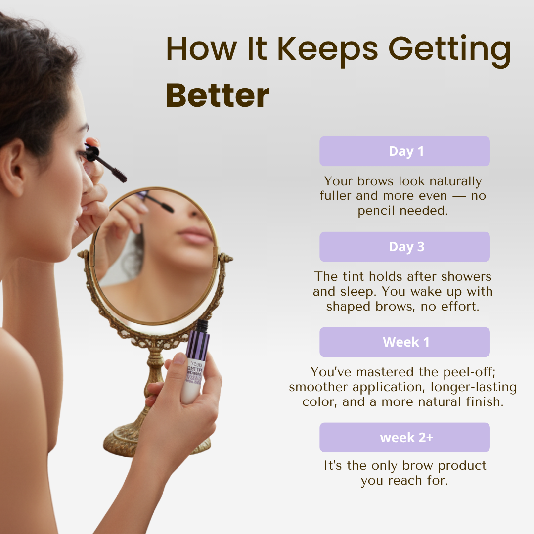 Just brush it on, let it set, and peel. No mess, no effort, no overdrawn brows — just a natural tint that lasts for days.
